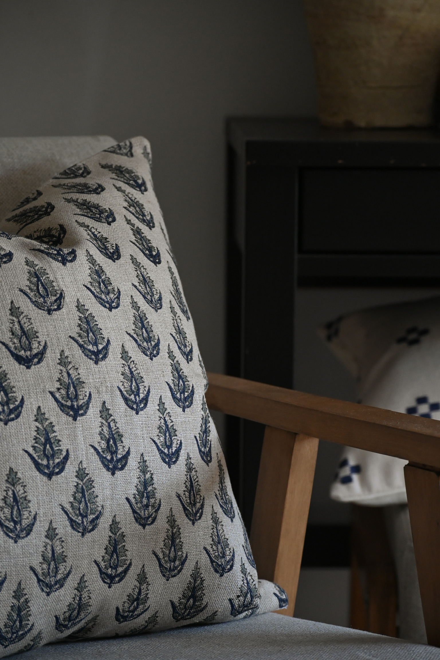Wykonana z oryginalnego indyjskiego lnu, barwiona ręcznie, metodą block print. Poszewka łączy w sobie tradycyjne rzemiosło, z nowoczesnym designem. Wyjątkowy wzór w naturalnych odcieniach dodaje wnętrzu głębi i charakteru.