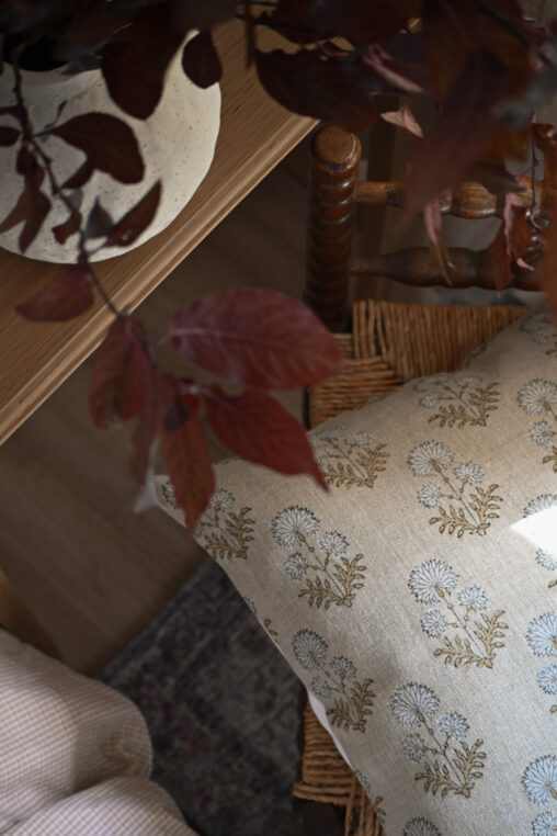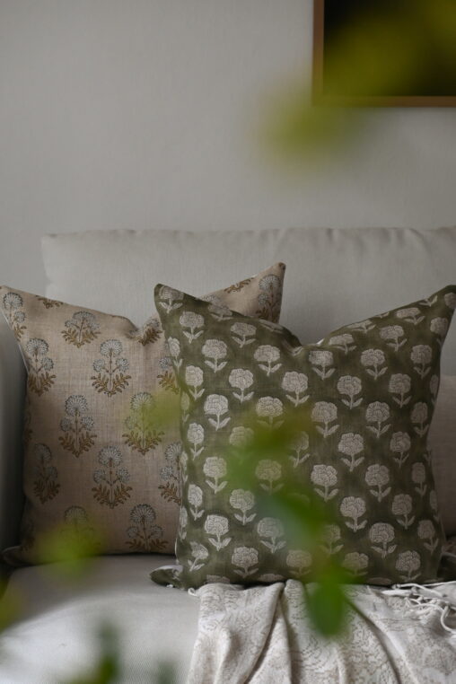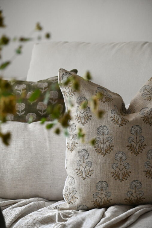 Wykonana z oryginalnego indyjskiego lnu, barwiona ręcznie, metodą block print. Poszewka łączy w sobie tradycyjne rzemiosło, z nowoczesnym designem. Wyjątkowy wzór w naturalnych odcieniach dodaje wnętrzu głębi i charakteru.